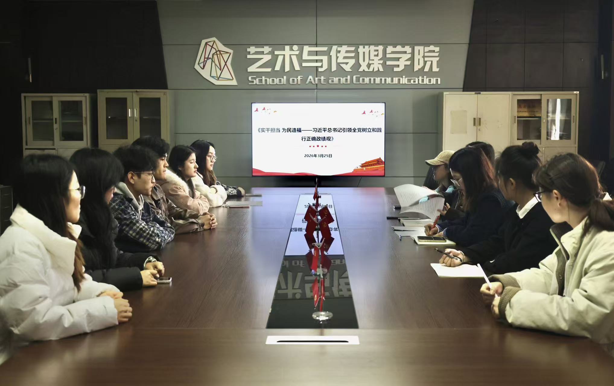 为深入学习贯彻党的最新理论成果,提升我院师生党员思想政治素养,2026年3月25日,艺术与传媒学院党总支在明德楼S513会议室以线上、线下相结合的形式召开三月基层党组织理论学习会,艺术与传媒学院师生党员代表参会学习。