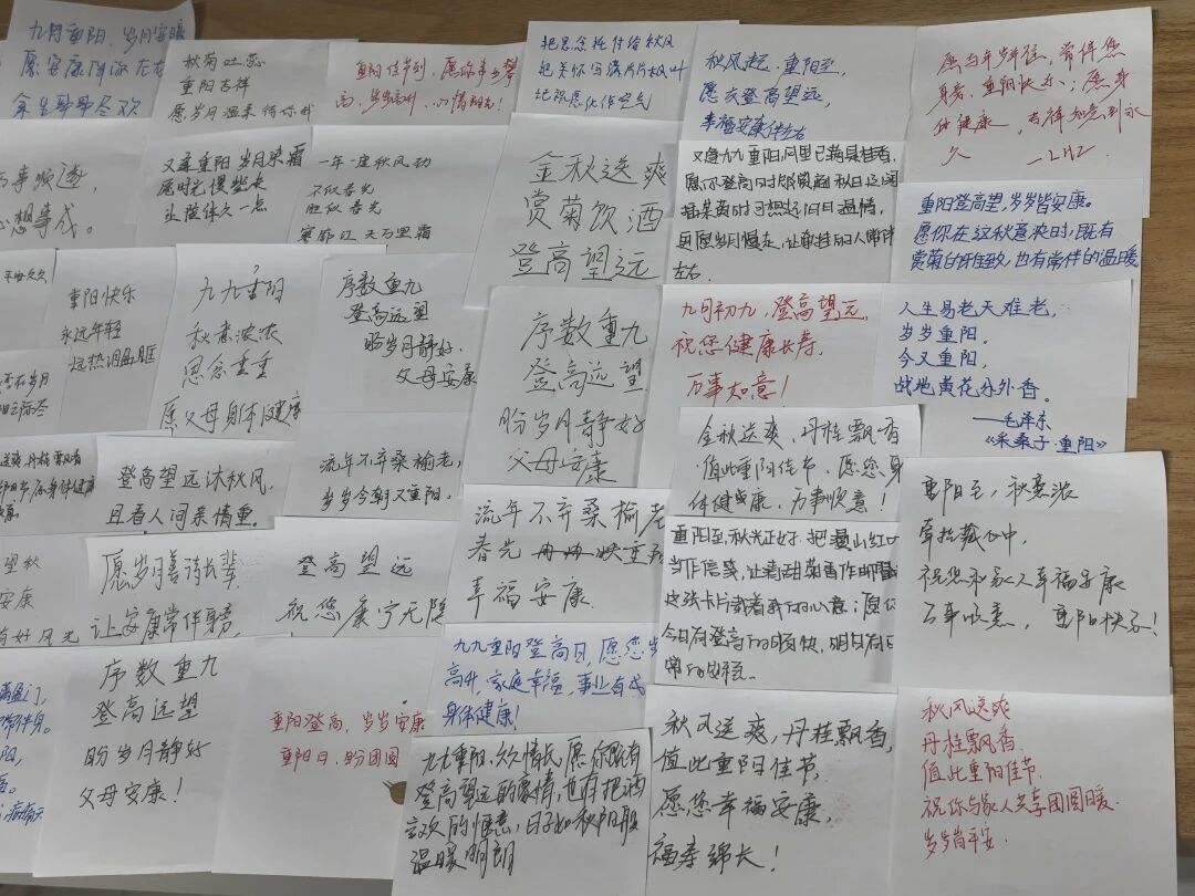 情在纸上,念在心里。以便签为载体,结合重阳佳节书写对长辈的深情寄语。便签是载体,真正的礼物是同学们的牵挂。本次重阳节便签寄语活动以简洁的形式,为同学们搭建了表达对长辈情感的平台,累计吸引350余名同学参与,活动全程秩序井然,从前期的物资筹备、现场布置,到活动中的引导协助,各环节衔接顺畅,既没有复杂的流程,却精准触达了“尊老敬老”的节日内核。