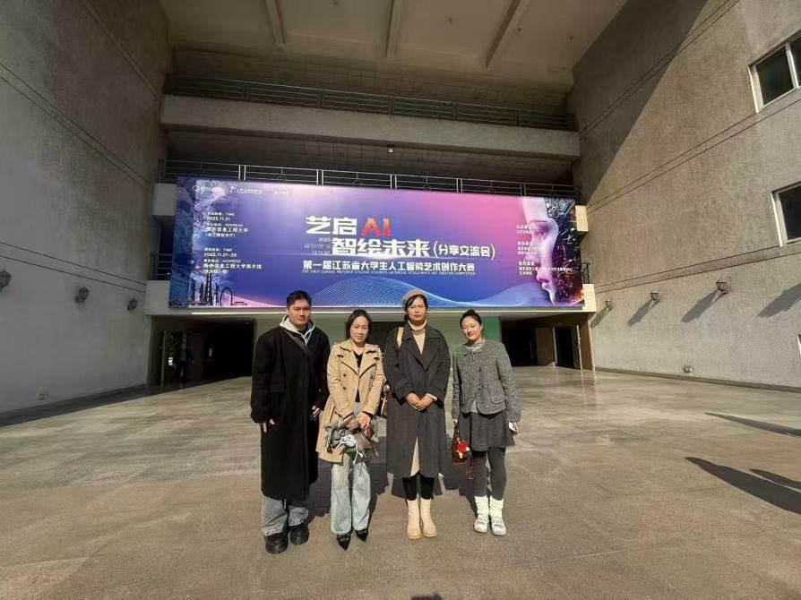 11月21日上午,由江苏省教育厅主办,南京信息工程大学、南京林业大学承办的“艺启AI·智绘未来”——第一届江苏省大学生人工智能艺术创作大赛优秀作品展在南京信息工程大学滨江楼美术馆隆重开幕。在新视界设计产业学院的支持下,艺术与传媒学院竞赛办公室负责人夏凡、数字媒体艺术教研室主任杨婷、广播电视编导专业组长张硕及学生代表前往参会。