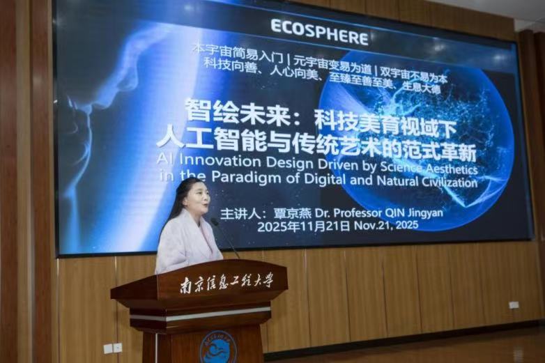开幕式现场还邀请了具有前沿AI艺术视野的专家学者——北京科技大学教授覃京燕。她以《智绘未来:科技美育视域下人工智能与传统艺术的范式革新》为题,从数实生态文明的价值内核入手,介绍了国内外优质AI作品,并系统阐释了人工智能、元宇宙、大数据等新一代信息技术如何引发设计生产力的范式性重塑。