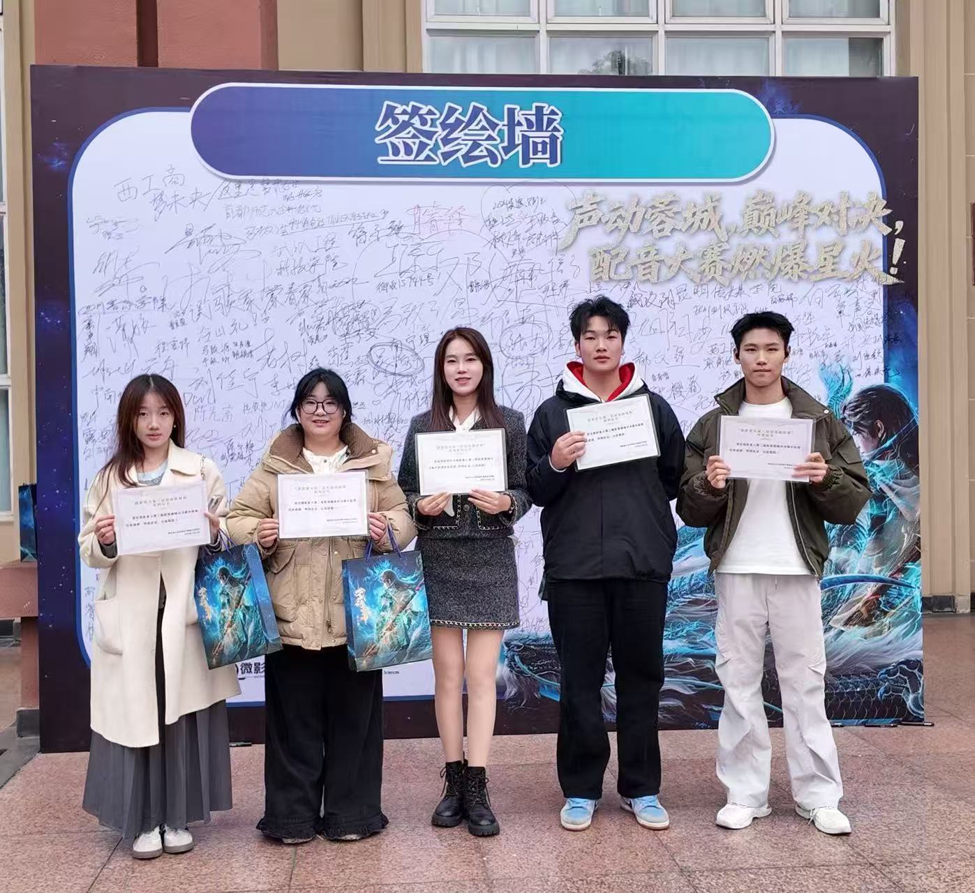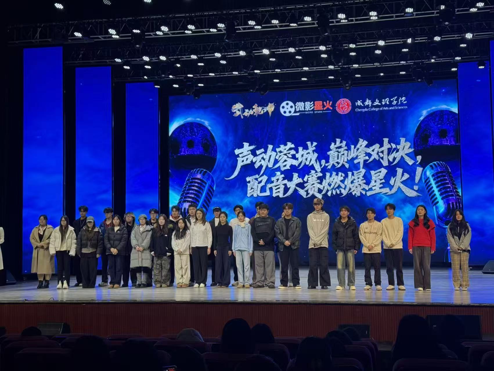 11月21日,由微影星火数字传媒产业学院主办、成都文理学院传媒与演艺学院承办的微影星火第二届高校配音踢馆赛在成都文理学院星空剧场圆满收官。活动得到武动乾坤动画特别支持,吸引全国19所高校的118位选手同台竞技,52部作品在现场集中展示。南京航空航天大学金城学院艺术与传媒学院播音主持专业派出王耀、蒙耀霆、丁晨曦、潘慧盈四位同学参赛,在尤含老师指导下,凭借稳定发挥与专业呈现,一举拿下最佳团队奖,尤含老师同时获得优秀指导奖。